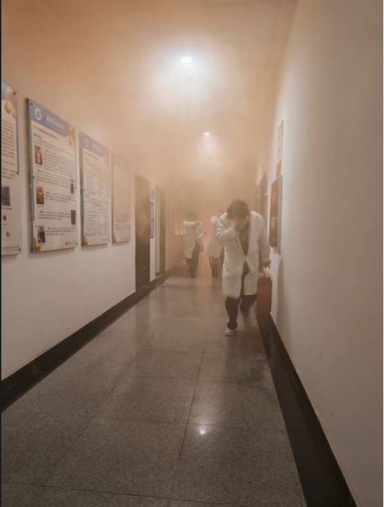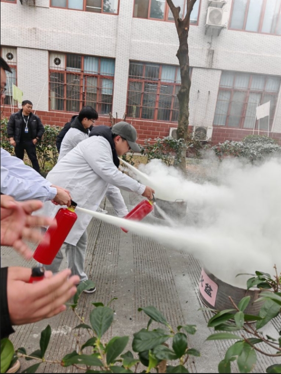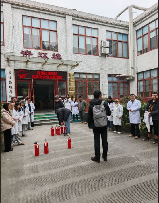 理论学习结束后,实战演练在资环楼内外有序开展。室外实操现场,模拟实验室火灾场景,点燃模拟火源,学院师生分组列队,在指导人员的现场示范与讲解下,依次上手实操灭火器灭火,严格遵循规范步骤完成火情处置,切实掌握实操技能;室内应急疏散演练中,模拟实验室烟雾扩散险情,师生们迅速响应,保持弯腰低姿、用湿巾捂住口鼻,按照预设疏散路线快速有序撤离至室外安全区域,整个过程反应迅速、配合默契,圆满完成疏散任务。