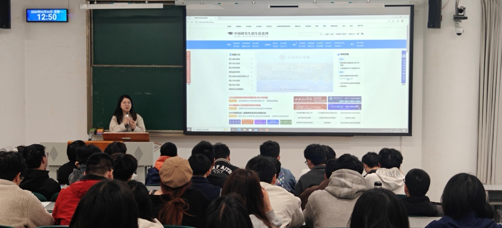 随后,学院研究生科科长刘韵老师围绕考研政策与流程,为同学们进行了详细解读。她系统介绍了考研的基本规则、关键时间节点、信息获取渠道以及备考过程中的常见注意事项,帮助同学们厘清了备考思路,使大家对考研的各个环节有了更加清晰、全面的认识。