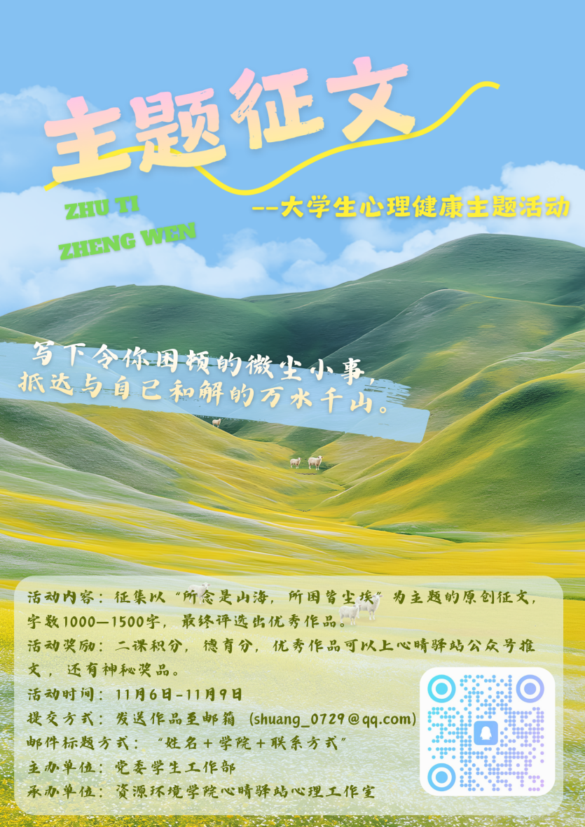 2025年11月,由成都信息工程大学党委学生工作部主办,资源环境学院承办的“所念是山海,所困是尘埃”主题征文比赛顺利开展,活动旨在帮助学生探寻现实与理想的平衡点,探索内心成长规律,同时为写作爱好者搭建展示平台。